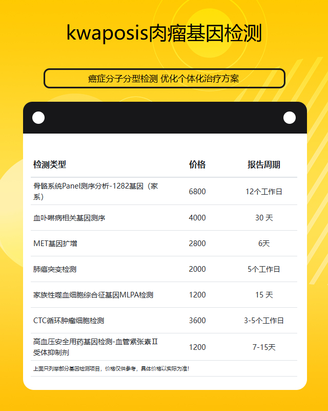 咨询范围:癌症基因检测、遗传疾病基因检测、安全用药基因检测、单基因检测、染色体异常基因检测、肿瘤基因检测、妇幼专项基因检测、全外显子基因检测、易感基因检测等,提供#Kaposis肉瘤# #肾癌# #骨肉瘤# #小细胞肺癌# #癌肺鳞# #肺假性淋巴瘤# #宫颈浸润癌# #管状小汗腺癌# #绝经期乳腺癌# #脑干肿瘤# #乳房纤维瘤# #肾上腺意外瘤# #矢状窦旁脑膜瘤# #头-面血管瘤综合征# #眼眶神经纤维瘤# #尿路上皮癌#等肿瘤基因检测综合业务咨询服务。