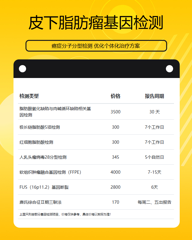 在肇庆地区,皮下脂肪瘤基因检测的价格通常在1000-5000元之间波动,具体费用取决于检测的基因位点数量、检测方法以及检测机构等因素。一般来说,检测的基因位点越多,价格就会相应提高。