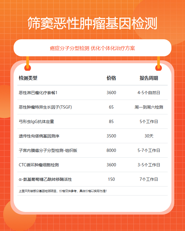 咨询范围:易感基因检测、单基因检测、染色体异常基因检测、妇幼专项基因检测、全外显子基因检测、癌症基因检测、遗传疾病基因检测、安全用药基因检测、肿瘤基因检测等,提供#筛窦恶性肿瘤# #肺癌# #霍奇金淋巴瘤# #嗜铬细胞瘤# #下咽癌# #胸腺瘤# #眼内黑色素瘤# #表皮松解性棘皮瘤# #肺部良性肿瘤# #腹膜肿瘤# #骨瘤# #海绵状淋巴管瘤# #精囊肿瘤# #前列腺肉瘤# #肾上腺意外瘤# #食管其他肿瘤#等肿瘤基因检测综合业务咨询服务。
