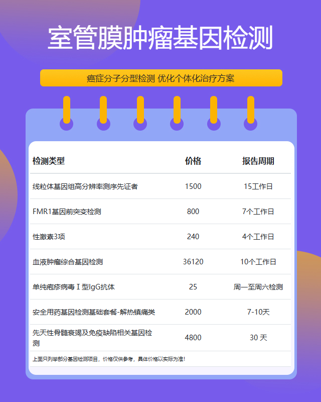 咨询范围:安全用药基因检测、癌症基因检测、肿瘤基因检测、遗传疾病基因检测、单基因检测、染色体异常基因检测、全外显子基因检测、妇幼专项基因检测、易感基因检测等,提供#室管膜肿瘤# #胃癌# #膀胱肿瘤# #多发性骨髓瘤病肾病# #副神经节起源的肿瘤# #骨化性纤维瘤# #骨外尤文氏瘤# #颌面部淋巴管瘤# #浆细胞白血病# #泪腺多形性腺癌# #浅表性皮肤脂肪瘤痣# #小肠肿瘤# #小儿肝肿瘤# #小儿颅后窝室管膜瘤# #胰腺囊腺癌# #痣样基底细胞癌#等肿瘤基因检测综合业务咨询服务。