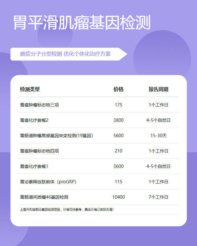 1. 单基因检测:针对与胃平滑肌瘤相关的特定基因进行检测,例如PDGFRA、KIT等基因。这类检测费用相对较低,适合有明确基因突变指向的患者。
