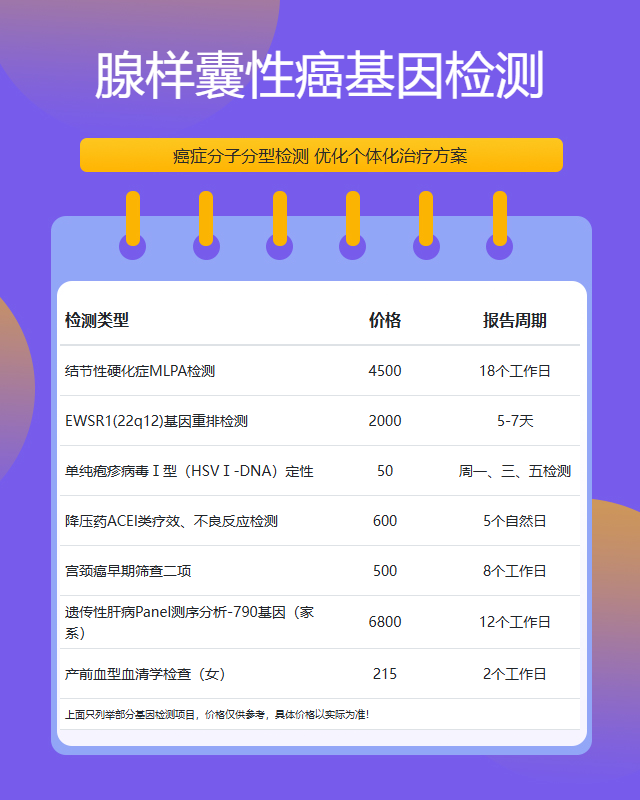 目前针对腺样囊性癌的检测主要采用下一代测序技术(NGS),可同时筛查MYB、NOTCH1等关键基因变异。部分机构提供包含50-500个癌症相关基因的检测套餐,患者需根据临床需求和经济条件选择。