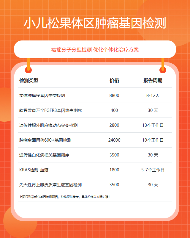 武汉小儿松果体区肿瘤基因检测的费用受多种因素影响,包括检测项目、技术平台、样本类型以及医疗机构定价等。一般来说,费用范围可能在几千元到上万元不等。家长在考虑基因检测时,需结合临床需求和家庭经济状况,选择适合的方案。