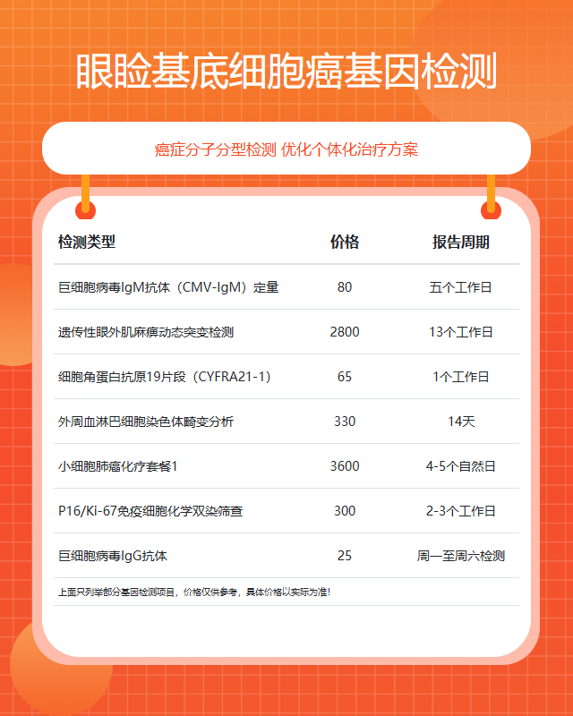 眼睑基底细胞癌基因检测费用因检测项目和机构不同有所差异。部分检测项目可能纳入医保报销范围,患者可咨询当地医保部门了解具体政策。建议在检测前与医疗机构确认收费标准和报销事宜。