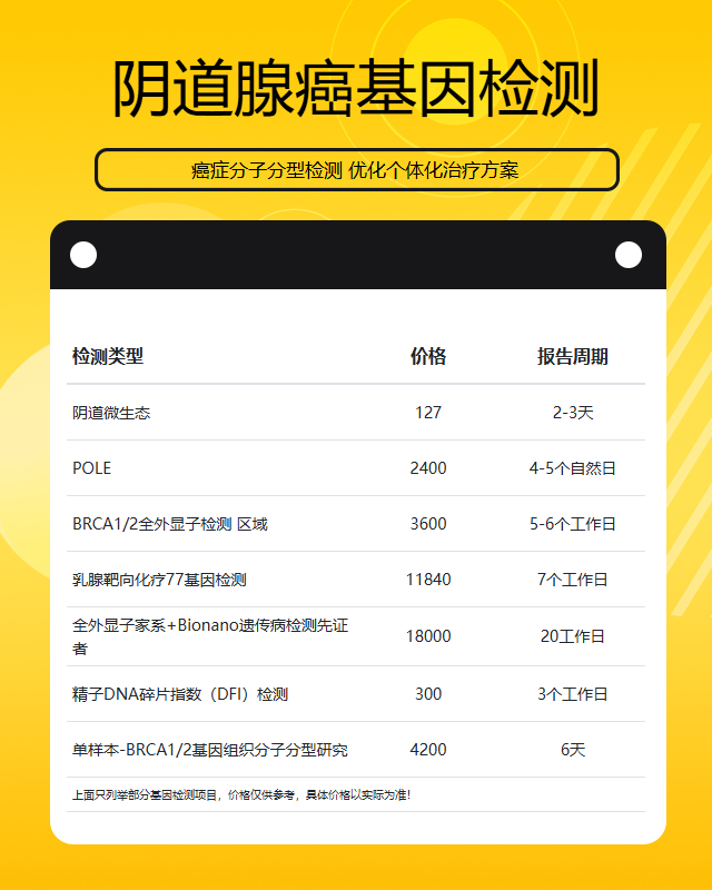 这些检测机构提供的服务通常包括:BRCA1/2基因检测、TP53基因检测、PIK3CA基因检测等与阴道腺癌相关的基因位点分析。检测方式一般采用二代测序技术,能够较为全面地筛查相关基因突变。