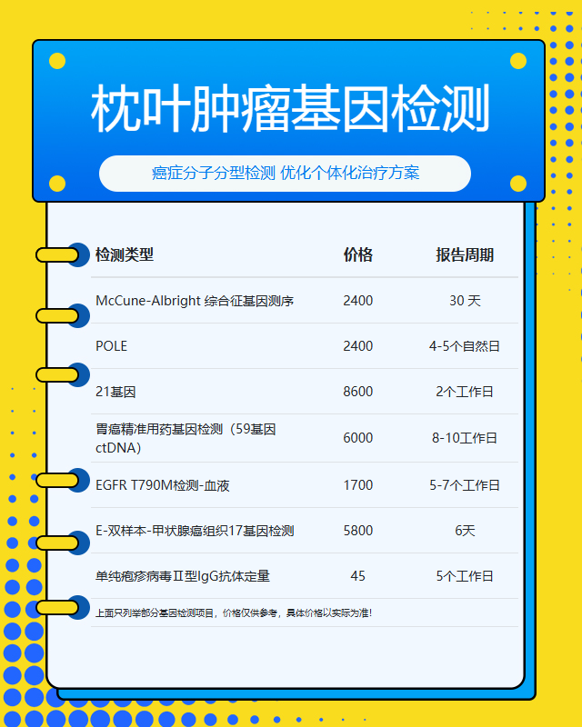 咨询范围:安全用药基因检测、肿瘤基因检测、全外显子基因检测、易感基因检测、单基因检测、妇幼专项基因检测、癌症基因检测、染色体异常基因检测、遗传疾病基因检测等,提供#枕叶肿瘤# #大肠平滑肌肉瘤# #多发内生软骨瘤病# #反分化软骨肉瘤# #骨血管肉瘤# #颌面部骨巨细胞瘤# #老年人肺癌# #颅后窝室管膜瘤# #皮肤脑膜瘤# #皮肤腺样囊性癌# #食管其他肿瘤# #视网膜母细胞瘤# #室管膜肿瘤# #输尿管肿瘤# #小儿白血病# #胰腺囊肿#等肿瘤基因检测综合业务咨询服务。