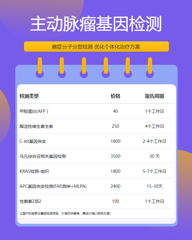 主动脉瘤相关的基因检测项目较多,包括但不限于FBN1、TGFBR1、TGFBR2、ACTA2等基因的检测。不同的检测项目针对不同的风险因素,建议在专业医生的指导下选择适合的检测方案。