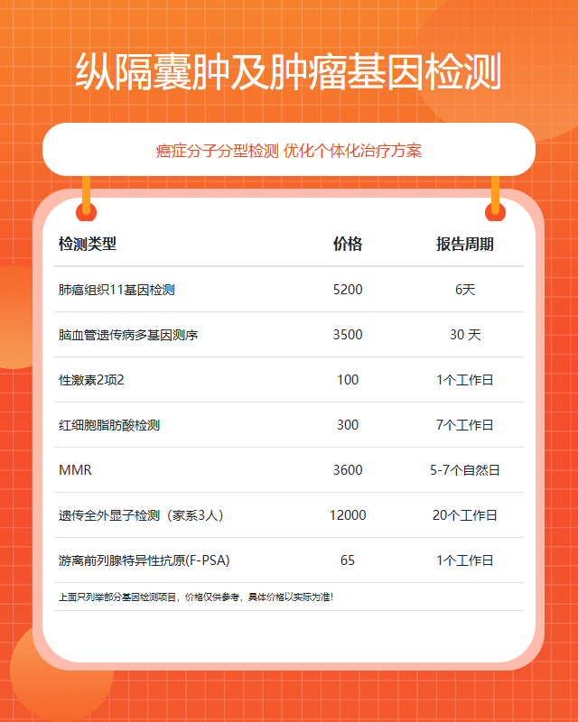 目前主流的基因检测技术包括PCR、FISH、NGS等,不同技术各有优势。对于纵隔囊肿及肿瘤,通常建议选择涵盖常见驱动基因和药物靶点的综合检测套餐。患者在选择时应根据临床医生的建议,结合自身病情和经济状况做出理性选择。