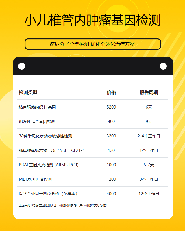 2. 检测项目:确认机构提供的检测是否包含与小儿椎管内肿瘤相关的特定基因位点。