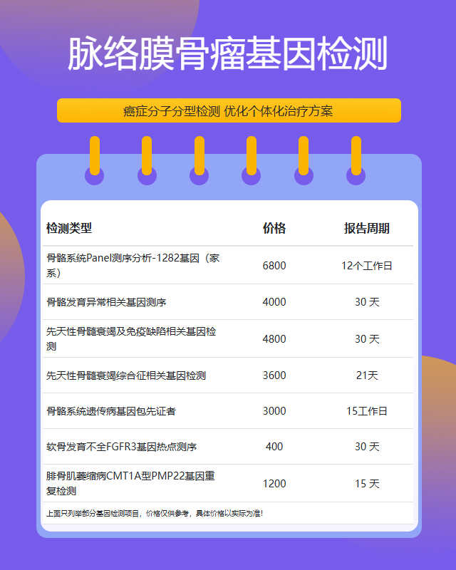 咨询范围:染色体异常基因检测、遗传疾病基因检测、全外显子基因检测、肿瘤基因检测、妇幼专项基因检测、癌症基因检测、易感基因检测、单基因检测、安全用药基因检测等,提供#脉络膜骨瘤# #儿童肝细胞癌# #横纹肌肉瘤# #软组织肉瘤# #皮内上皮癌# #残胃淋巴瘤# #骨软骨瘤# #毛胚细胞瘤# #妊娠合并宫颈癌# #软骨母细胞瘤# #小儿肝母细胞瘤# #小儿骨肉瘤# #眼眶骨瘤# #眼眶静脉性血管瘤# #胰腺肿瘤# #膀胱癌尿路上皮癌#等肿瘤基因检测综合业务咨询服务。
