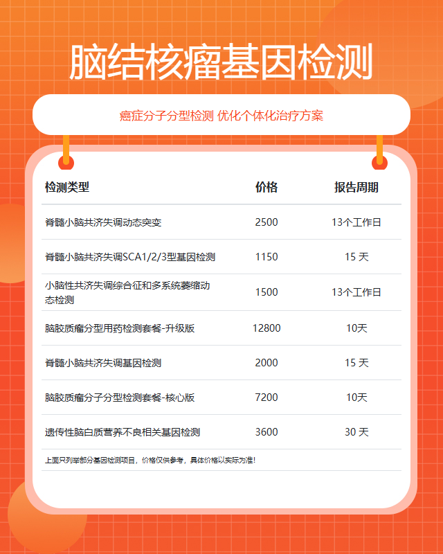 宿迁脑结核瘤基因检测通常包括结核分枝杆菌DNA检测、耐药基因分析等不同项目。基础检测价格可能在1000-2000元之间,若需要同时检测多种耐药基因,费用可能增加至3000-5000元不等。