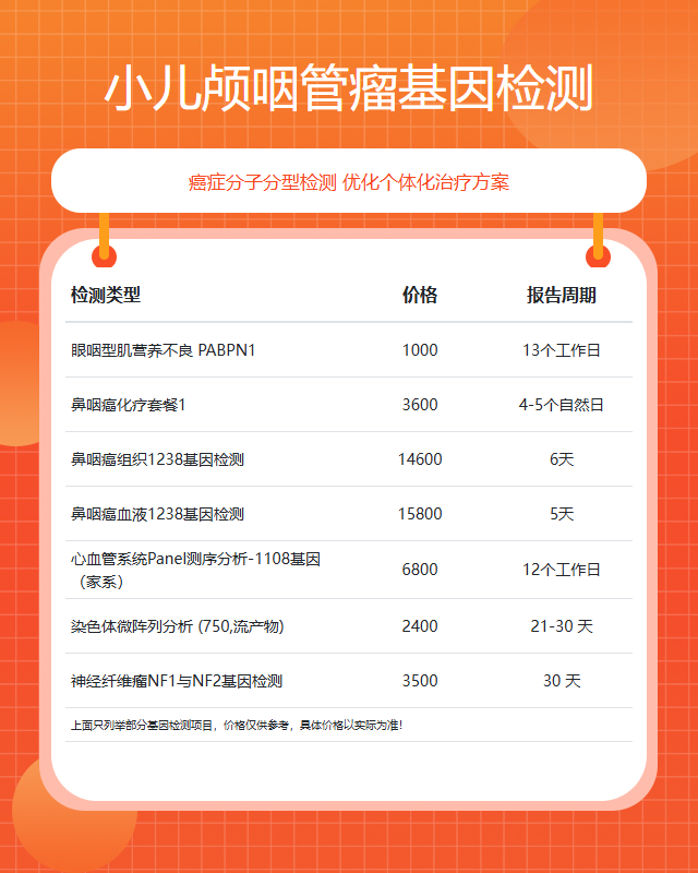 咨询范围:安全用药基因检测、全外显子基因检测、妇幼专项基因检测、遗传疾病基因检测、染色体异常基因检测、易感基因检测、肿瘤基因检测、癌症基因检测、单基因检测等,提供#小儿颅咽管瘤# #粘液瘤# #脂肪瘤# #隆突性皮肤纤维肉瘤# #癌性神经肌病# #癌肿性关节炎# #间皮瘤# #副乳乳腺癌# #颌面部骨巨细胞瘤# #颈部血管瘤# #卵巢纤维瘤# #腮腺肿瘤# #上颌窦肿瘤# #涎腺的未分化癌# #胸腺囊肿# #眼眶脂肪肉瘤#等肿瘤基因检测综合业务咨询服务。