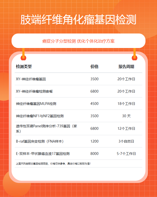 咨询范围:染色体异常基因检测、妇幼专项基因检测、肿瘤基因检测、单基因检测、全外显子基因检测、遗传疾病基因检测、癌症基因检测、安全用药基因检测、易感基因检测等,提供#肢端纤维角化瘤# #肉瘤# #纤维瘤# #血管瘤# #鼻咽癌# #副神经节瘤# #嗜铬细胞瘤# #肝海绵状血管瘤# #高分化鳞癌# #宫颈微小型浸润癌# #骨软骨瘤# #骨样骨瘤# #卵巢畸胎瘤# #脑膜瘤# #输尿管肿瘤# #血管内皮瘤#等肿瘤基因检测综合业务咨询服务。