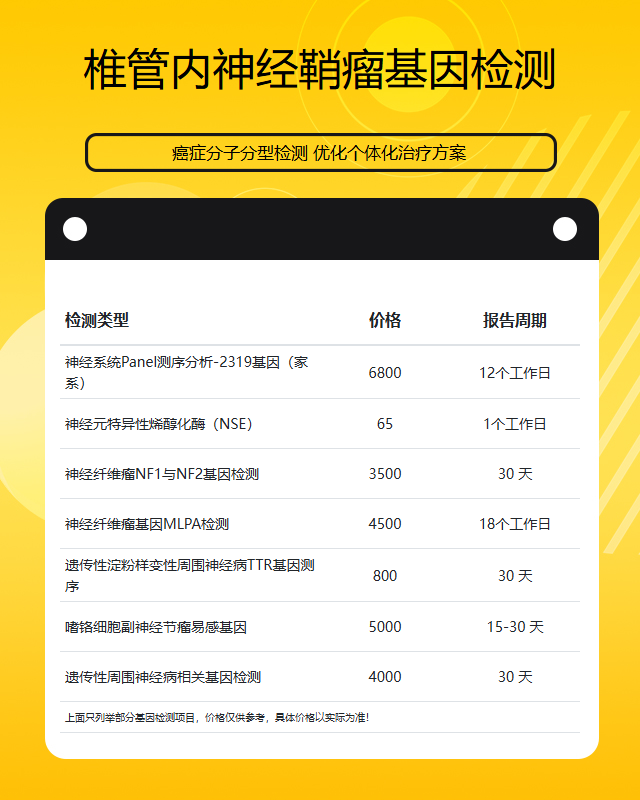 椎管内神经鞘瘤是一种发生在脊髓或神经根周围的良性肿瘤,其发生可能与特定基因突变有关。基因检测可以帮助明确病因、评估遗传风险或指导治疗方案。在阜阳地区,此类基因检测的费用通常介于3000元至10000元之间,具体价格受多种因素影响。