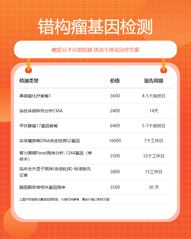 咨询范围:全外显子基因检测、易感基因检测、染色体异常基因检测、癌症基因检测、安全用药基因检测、妇幼专项基因检测、肿瘤基因检测、遗传疾病基因检测、单基因检测等,提供#错构瘤# #腮腺肿瘤# #骨癌# #甲状旁腺癌# #鼻神经胶质瘤# #汗腺癌# #急性白血病# #卵巢浆液性肿瘤# #脑膜癌病# #皮脂腺癌# #浅表性皮肤脂肪瘤痣# #乳房外湿疹样癌# #肾肿瘤# #小儿松果体区肿瘤# #小儿星形细胞瘤# #家族性成神经细胞瘤#等肿瘤基因检测综合业务咨询服务。
