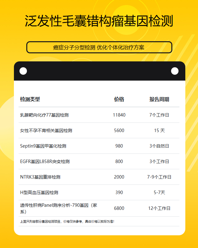 咨询范围:遗传疾病基因检测、妇幼专项基因检测、全外显子基因检测、染色体异常基因检测、安全用药基因检测、易感基因检测、癌症基因检测、肿瘤基因检测、单基因检测等,提供#泛发性毛囊错构瘤# #宫颈癌# #浆细胞瘤# #肺错构瘤# #腹膜间皮瘤# #黑棘皮瘤# #结肠癌# #绝经后子宫颈癌# #卵巢畸胎瘤# #脑室内脑膜瘤# #尿道旁腺癌# #软组织肿瘤# #腮腺混合瘤# #眼眶横纹肌肉瘤# #眼眶脂肪肉瘤# #咽喉部肿瘤#等肿瘤基因检测综合业务咨询服务。