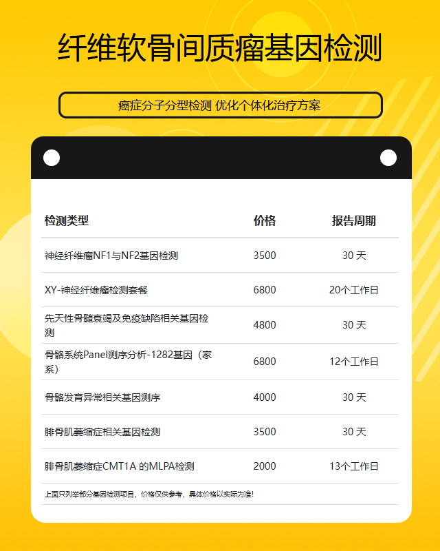 具体来说,如果仅检测与纤维软骨间质瘤明确相关的单一基因,费用可能在3000-5000元。而涉及肿瘤相关基因panel的检测,覆盖数十个甚至上百个基因,价格会上升到6000-10000元。全外显子组测序等技术更全面,但价格也相应更高。