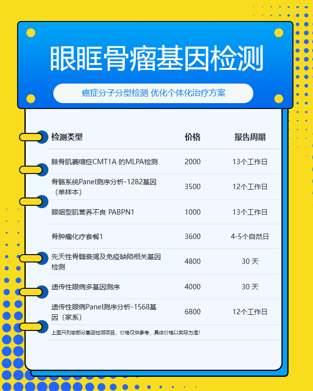 对于检测费用问题,目前贵阳地区的眼眶骨瘤基因检测价格区间较大,主要取决于检测范围和机构资质。建议不要单纯以价格作为选择标准,而应综合考虑机构的专业水平和服务质量。